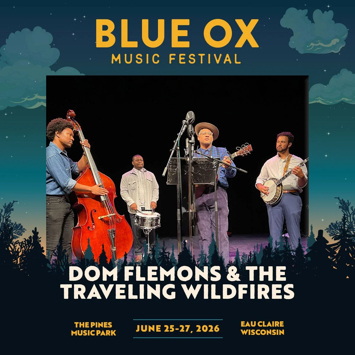 "I created “The Traveling Wildfires” after the International Bluegrass Music Conference inducted Arnold Shultz into the Bluegrass Hall of Fame in 2025. I was inspired by the story of Arnold Shultz who was an African American musician that influenced Bill and Charlie Monroe and this is my way of continuing his legacy which still resonates within bluegrass. The structure of “The Traveling Wildfires” was inspired by Bill Monroe and The Bluegrass Boys which had a rotating cast of musicians throughout the decades. Plus, I wanted to make sure that the music reached beyond bluegrass and covered American roots music as a whole. It’s so exciting to bring this vision to life and I can’t wait for “The Traveling Wildfires” to take the music to the next level." — Dom Flemons